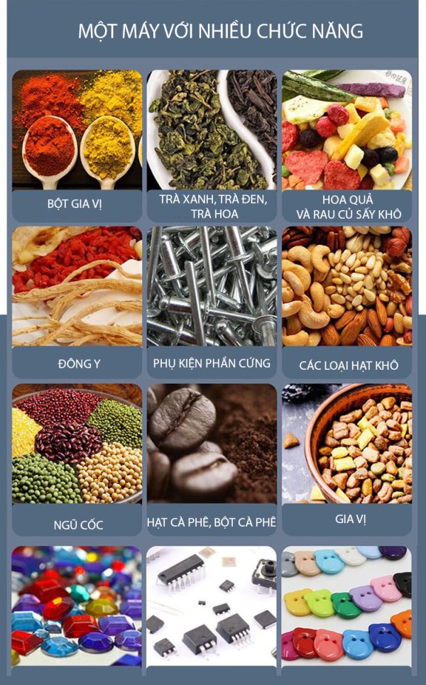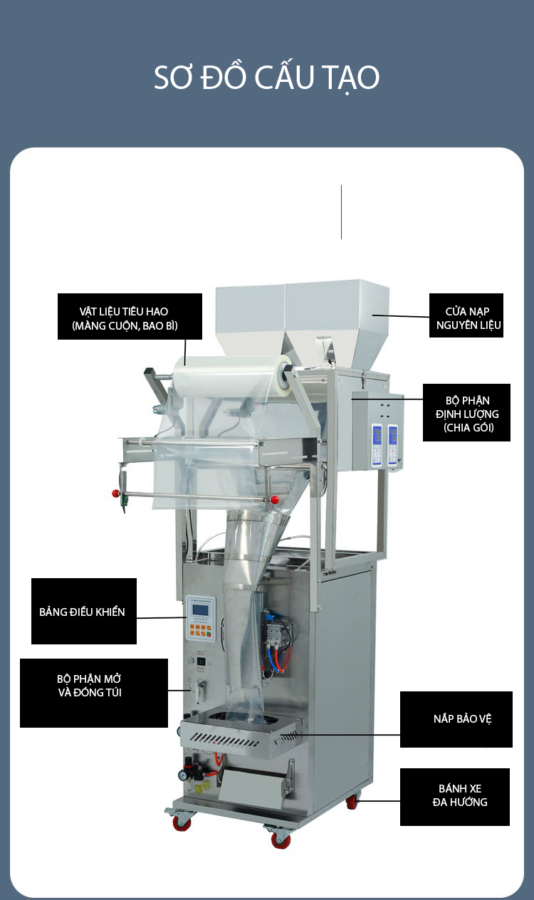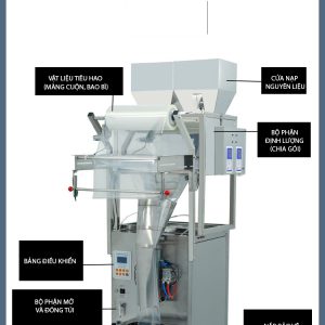 - Phễu chứa nguyên liệu: Nơi chứa sản phẩm đầu vào (bột, hạt, viên…).