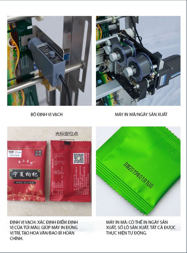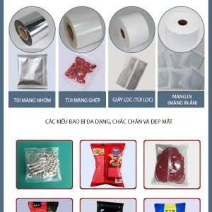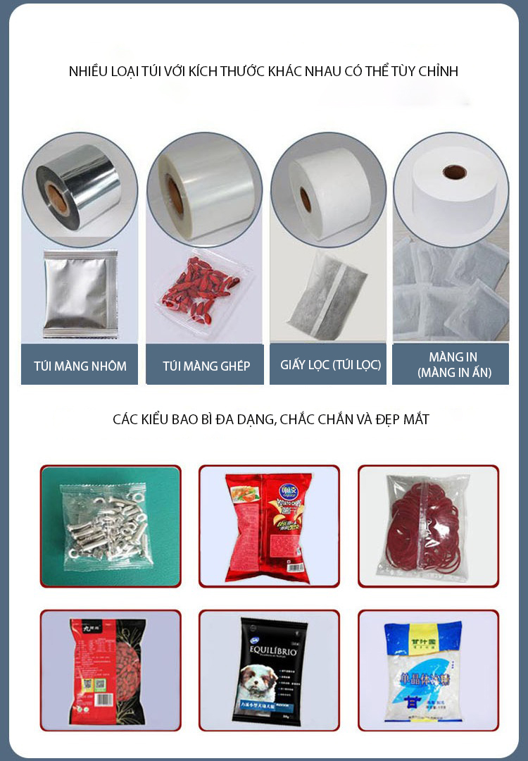 - Bộ phận tạo túi và hàn miệng: Đây là phần tích hợp của máy đóng gói, tự động tạo túi từ cuộn màng, hàn mép và hàn kín miệng túi sau khi sản phẩm đã được xả vào.