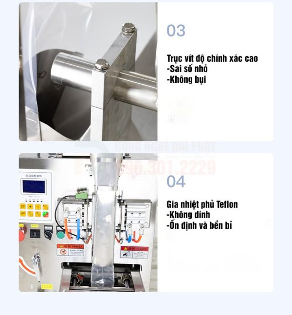 - Sau khi sản phẩm được trục vít xả vào túi, bộ phận hàn nhiệt sẽ hàn kín miệng túi và dao cắt sẽ cắt rời túi thành phẩm.